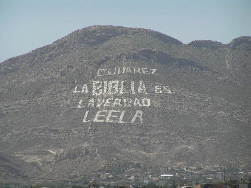The text on the mountain advises the residents of Juarez, “The Bible is the truth. Read it.”