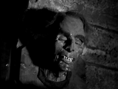 The final confrontation between Orlok and Thompson is satisfying on a number of levels (beware of spoilers in this paragraph), beyond the simple enjoyment of seeing Karloff bitch-slap the young villain until he’s reduced to sniveling in fetal position. An optical illusion in which Thompson cannot differentiate between the two-dimensional screen image of Orlok and the real man advancing to disarm him may symbolize Thompson’s inability to differentiate his own twisted fantasies from reality. Orlok’s triumph may also signify that fictional horrors can serve as a protective factor against real-life horrors by exposing them for what they are. Having subdued Thompson, Orlok muses, “Is this what I was afraid of?”